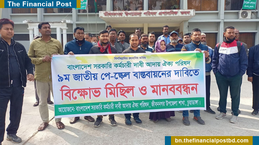 চুয়াডাঙ্গার জীবননগরে সরকারি কর্মচারীরা ৯ম জাতীয় পে-স্কেল বাস্তবায়নের দাবিতে মানববন্ধন করেছে।