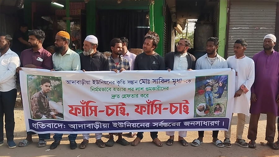 পটুয়াখালীর বাউফল উপজেলার আদাবাড়িয়া ইউনিয়নের সাকিল মৃধাকে হাত-পা বেঁধে নির্মমভাবে হত্যার ঘটনায় জড়িতদের দ্রুত গ্রেফতার ও ফাঁসির দাবিতে বিক্ষোভ মিছিল ও মানববন্ধন করেছে এলাকাবাসী।