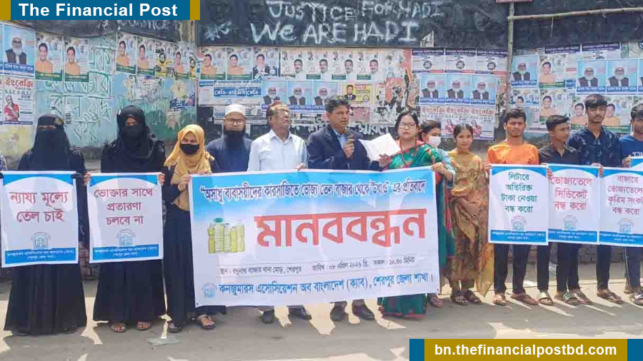 বাজারে ভোজ্য তেলের কৃত্রিম সংকট সৃষ্টি করে সাধারণ ভোক্তাদের ভোগান্তিতে ফেলার অভিযোগে শেরপুরে প্রতিবাদী মানববন্ধন কর্মসূচি পালন করেছে ভোক্তা অধিকার সংগঠন কনজ্যুমার অ্যাসোসিয়েশন অব বাংলাদেশ (ক্যাব)।