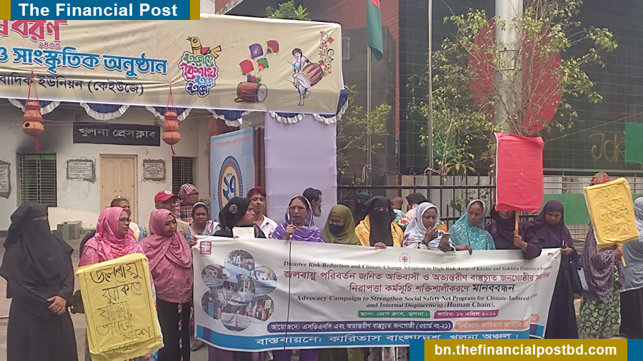 আজ বৃহস্পতিবার বেলা সাড়ে ১১টায় খুলনা প্রেস ক্লাবের সামনে স্যার ইকবাল রোডে জলবায়ু-অভিবাসীদের উদ্যোগে মানববন্ধন অনুষ্ঠিত হয়। কর্মসূচিতে খুলনা সিটি করপোরেশনের ৯, ২১, ২২ এবং ৩১ নং ওয়ার্ডের প্রায় ২০০ জন জলবায়ু পরর্বিতনজনতি অভবিাসী ও অভ্যন্তরীণ বাস্তুচ্যুত জনগোষ্ঠী অংশগ্রহণ করেন।