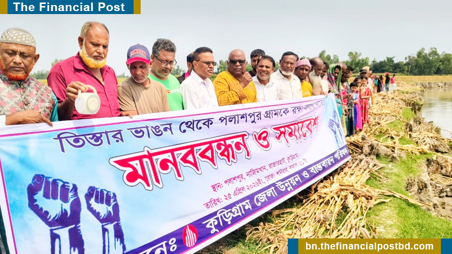 কুড়িগ্রামে তিস্তা নদীর ভাঙনে বসতভিটা ও আবাদি জমি হারানো ক্ষতিগ্রস্তদের ক্ষতিপূরণ এবং কুড়িগ্রামের রাজারহাট উপজেলার নাজিমখান ইউনিয়নের পলাশপুর গ্রাম রক্ষার দাবিতে মানববন্ধন ও সমাবেশ করেছেন এলাকাবাসী।