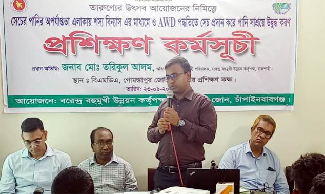 চাঁপাইনবাবগঞ্জে তারুণ্যের উৎসব আয়োজনের নিমিত্ত্বে বরেন্দ্র বহুমুখী উন্নয়ন কর্তৃপক্ষের (বিএমডিএ) আয়োজনে সেচের পানির অপর্যাপ্ততা এলাকায় শস্য বিন্যাস এর মাধ্যমে ও ডব্লিউডি পদ্ধতিতে সেচ প্রদান করে পানি সাশ্রয়ে উদ্বুদ্ধ করণ প্রশিক্ষণ কর্মশালা অনুষ্ঠিত হয়েছে।