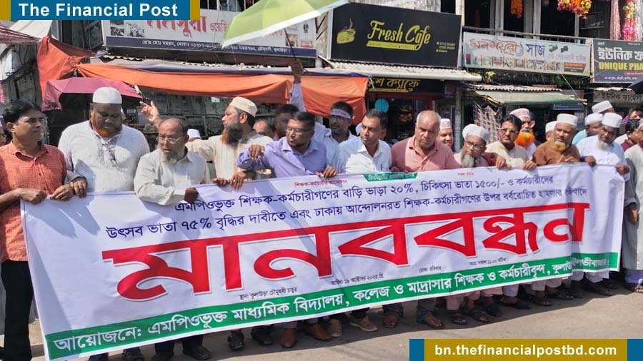 মৌলভীবাজারের কুলাউড়ায় এমপিওভুক্ত শিক্ষকদের বাড়ি ভাড়া ২০ শতাংশ, চিকিৎসা ভাতা ১৫০০ টাকা ও কর্মচারীদের উৎসব ভাতা ৭৫ শতাংশ বৃদ্ধির দাবীতে এবং ঢাকায় আন্দোলনরত শিক্ষক-কর্মচারীদের উপর বর্বরোচিত হামলার প্রতিবাদে এক বিশাল মানববন্ধন কর্মসূচি অনুষ্ঠিত হয়েছে। রবিবার (১৯ অক্টোবর) দুপুরে কুলাউড়া উপজেলার এমপিওভুক্ত মাধ্যমিক বিদ্যালয়, কলেজ ও মাদ্রাসার শিক্ষক ও কর্মচারীবৃন্দের আয়োজনে পৌর শহরের স্টেশন চৌমুহনীতে এ কর্মসূচি অনুষ্ঠিত হয়। উপজেলার মাধ্যমিক পর্যায়ের সকল স্কুল, কলেজ ও মাদ্রাসার শিক্ষক ও কর্মচারীরা স্ব স্ব প্রতিষ্ঠানের ব্যানার নিয়ে অংশ নেন। প্রথমে কুলাউড়া বালিকা উচ্চ বিদ্যালয় থেকে কয়েক শতাধিক শিক্ষক-কর্মচারী একত্রিত হয়ে মিছিল সহকারে স্টেশন চৌমুহনীতে মানববন্ধনে মিলিত হন। মানববন্ধন চলাকালে পৌর শহরের প্রধান সড়কে তীব্র যানজটের সৃষ্টি হয়।