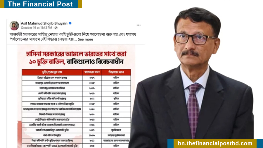 উল্লেখ্য, অন্তর্বর্তী সরকারের স্থানীয় সরকার উপদেষ্টা আসিফ মাহমুদ সজীব ভূঁইয়া সোমবার ফেসবুকে একটি ফটোকার্ড শেয়ার করেছিলেন, যেখানে দাবি করা হয়, ভারতের সঙ্গে ১০টি চুক্তি ও প্রকল্প বাতিল, বাকিগুলোও বিবেচনাধীন।