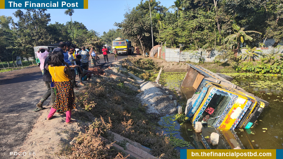 দুর্ঘটনাস্থলে গিয়ে দেখা যায়, সদ্য নির্মিত রাস্তার একাংশ ধসে পুকুরে নেমে গেছে। পানিতে ডুবে থাকা ট্রাকটির ইন্ডিকেটর তখনও জ্বলছিল। ঘটনাস্থলে শতাধিক উৎসুক জনতা ভিড় করেন।