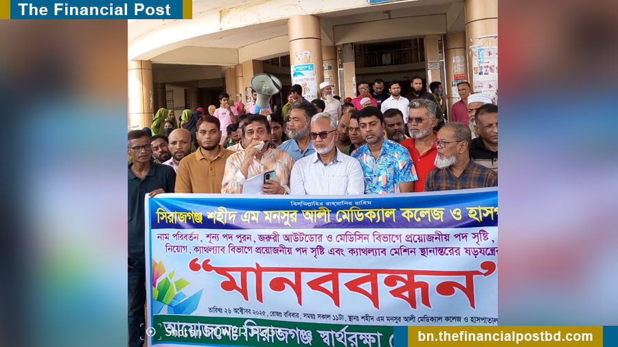 সিরাজগঞ্জ শহীদ এম মনসুর আলী মেডিক্যাল কলেজ ও হাসপাতালে নাম পরিবর্তন, শূন্য পদ পূরণ, জরুরি, আউটডোর ও মেডিসিন বিভাগে প্রয়োজনীয় নতুন পদ সৃষ্টি, ক্যাথল্যাব বিভাগে স্থায়ী জনবল নিয়োগ এবং ক্যান্সার বিভাগের পূর্ণাঙ্গ কার্যক্রম চালুর দাবিতে মানববন্ধন অনুষ্ঠিত হয়েছে।