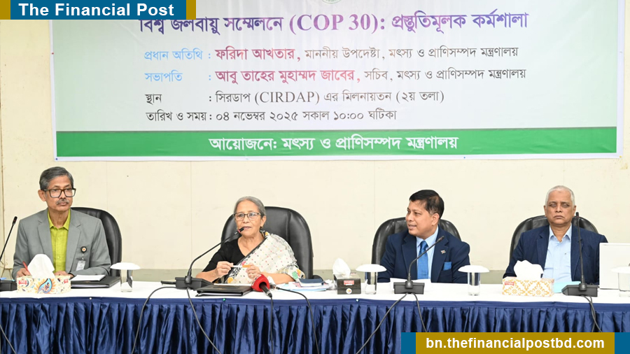 কর্মশালায় সভাপতিত্ব করেন মৎস্য ও প্রাণিসম্পদ মন্ত্রণালয়ের সচিব আবু তাহের মুহাম্মদ জাবের। স্বাগত বক্তব্য প্রদান করেন মন্ত্রণালয়ের অতিরিক্ত সচিব মোঃ ইমাম উদ্দীন কবীর। “বিশ্ব জলবায়ু সম্মেলন (COP-30)”–এর ধারণাপত্র উপস্থাপন করেন পরিবেশ, বন ও জলবায়ু পরিবর্তন মন্ত্রণালয়ের অতিরিক্ত সচিব মোহাম্মদ নাভিদ শফিউল্লাহ।