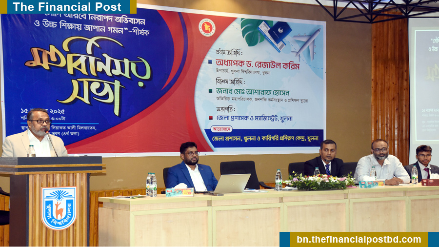 ‘সৌদি আরবে নিরাপদ অভিবাসন ও উচ্চ শিক্ষায় জাপান গমন’ শীর্ষক এক মতবিনিময় সভায় শনিবার (১৫ নভেম্বর) বিকেলে খুলনা বিশ্ববিদ্যালয়ের সাংবাদিক লিয়াকত আলী মিলনায়তনে অনুষ্ঠিত হয়েছে। খুলনা জেলা প্রশাসন ও খুলনা কারিগরি প্রশিক্ষণ কেন্দ্র (টিটিসি) আয়োজিত এ অনুষ্ঠানে প্রধান অতিথি ছিলেন খুলনা বিশ্ববিদ্যালয়ের উপাচার্য প্রফেসর ড. মোঃ রেজাউল করিম।
