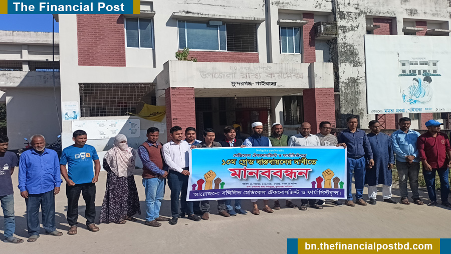 সরকারি হাসপাতালসমূহে কর্মরত মেডিকেল টেকনোলজিস্ট ও ফার্মাসিস্টদের পদমর্যাদা ১১তম গ্রেড থেকে ১০ম গ্রেডে উন্নীতকরণের দাবিতে গাইবান্ধার সুন্দরগঞ্জে মানববন্ধন অনুষ্ঠিত হয়েছে।