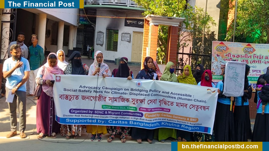 খুলনা প্রেস ক্লাবের সামনে স্যার ইকবাল রোডে বুধবার (১৯ নভেম্বর) খুলনা সিটি কর্পোরেশনের জলবায়ু—অভিবাসীদের উদ্যোগে একটি শান্তিপূর্ণ মানববন্ধন অনুষ্ঠিত হয়। কারিতাস খুলনা অঞ্চলের ‘ডিআরআর এবং সিসিএ’ প্রকল্পের সহায়তায় আয়োজিত এই মানববন্ধনে ০৯, ২১, ২২ এবং ৩১ নং ওয়ার্ডের প্রায় ২০০ জন জলবায়ু–বিপর্যস্ত মানুষ অংশগ্রহণ করেন। মানববন্ধনের মূল প্রতিপাদ্য ছিল— “উচ্ছেদ হওয়া জনগোষ্ঠীর জন্য সামাজিক সুরক্ষা সেবায় প্রবেশাধিকারে মানবিক সেতুবন্ধন।”