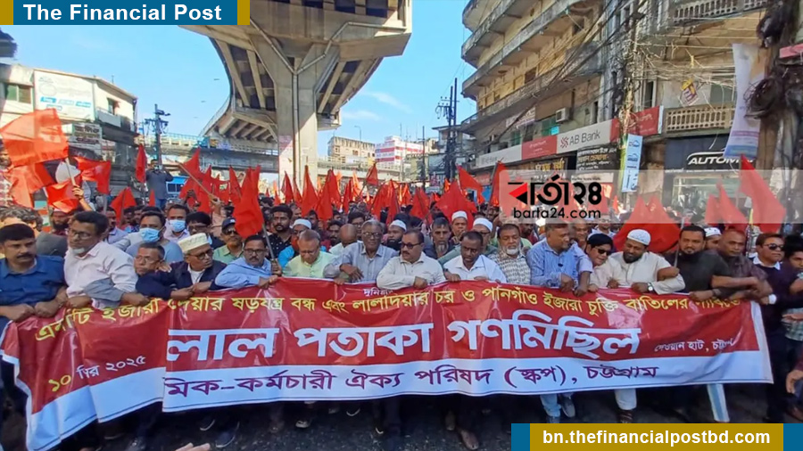 চট্টগ্রাম বন্দরের নিউমুরিং কনটেইনার টার্মিনালসহ গুরুত্বপূর্ণ স্থাপনা বিদেশি প্রতিষ্ঠানের কাছে ইজারা দেওয়ার উদ্যোগের প্রতিবাদে শ্রমিক-কর্মচারী ঐক্য পরিষদ (স্কপ) ‘লাল পতাকা গণমিছিল’ করেছে।