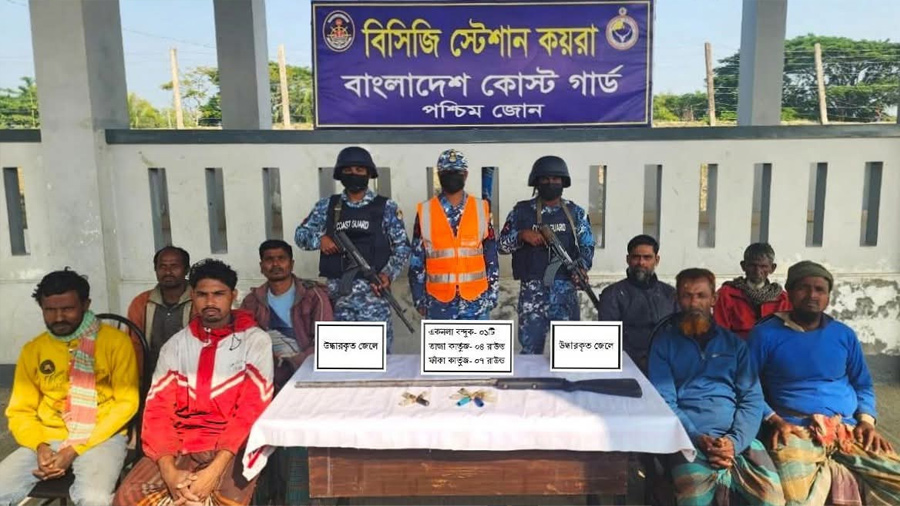 সুন্দরবনের দুর্ধর্ষ ডাকাত জাহাঙ্গীর বাহিনীর আস্তানা হতে অস্ত্র- গোলাবারুদ সহ জিম্মি থাকা ৮ জেলেকে উদ্ধার করেছে কোস্ট গার্ড।