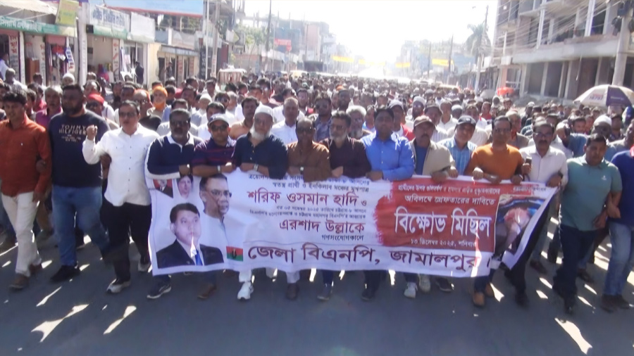 ওসমান হাদির উপর হামলার প্রতিবাদে জামালপুরে বিক্ষোভ মিছিল