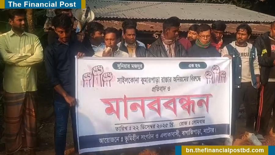 নাটোরের বাগাতিপাড়া উপজেলার সাইলকোনা কুমারপাড়া এলাকায় রাস্তা নির্মাণে অনিয়মের অভিযোগে মানববন্ধন কর্মসূচি পালন করেছে এলাকাবাসী।