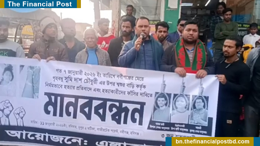 সুনামগঞ্জ সদর উপজেলার ধোপাখালি এলাকায় নবীগঞ্জের গৃহবধূ সুমি দাশ (২১) হত্যাকাণ্ডের সুষ্ঠু বিচার ও দোষীদের সর্বোচ্চ শাস্তির দাবিতে নবীগঞ্জে মানববন্ধন অনুষ্ঠিত হয়েছে।