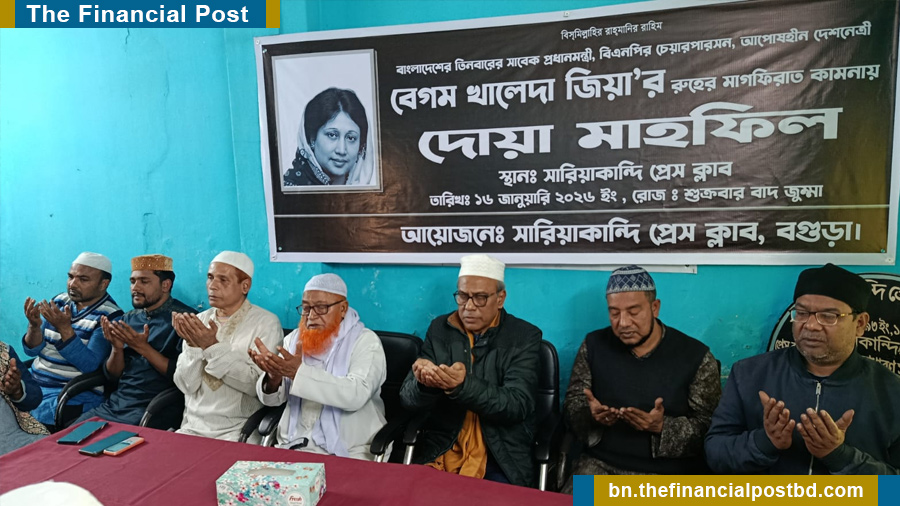 সাবেক প্রধানমন্ত্রী ও বিএনপির সাবেক চেয়ারপার্সন মরহুমা বেগম খালেদা জিয়ার রুহের মাগফেরাত কামনায় সারিয়াকান্দি প্রেসক্লাবের উদ্যোগে দোয়া মাহফিল অনুষ্ঠিত হয়েছে।