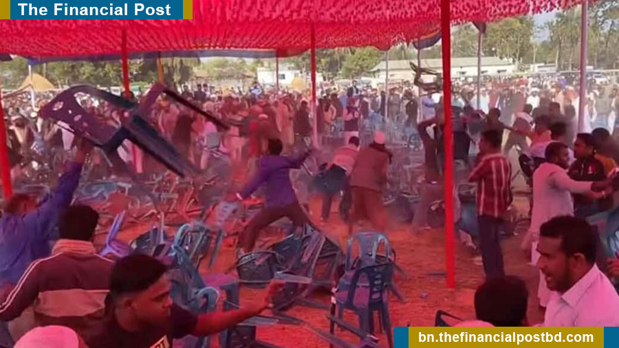 এদিকে জামায়াতে ইসলামী মনোনীত প্রার্থী নুরুজ্জামান বাদলের নেতাকর্মীরা আগে থেকেই চেয়ারে বসা থাকলেও বিএনপি'র প্রার্থী মাহমুদুল হক রুবেল অনুষ্ঠানস্থলে না পৌঁছায় বিএনপি'র আগত নেতাকর্মীরা অপেক্ষায় ছিলেন। ফলে চেয়ারে সবার বসা হয়নি। এসময় চেয়ারে বসা নিয়ে জামায়াতের নেতাকর্মীদের সঙ্গে বিএনপি'র নেতাকর্মীদের বাকবিতণ্ডা থেকে চেয়ার ছুঁড়াছুঁড়ি শুরু হয়। একপর্যায়ে রণক্ষেত্রে পরিণত হয় অনুষ্ঠানস্থল। ভেঙে ও পুড়িয়ে দেওয়া হয় বেশ কয়েকটি মোটরসাইকেল। লণ্ডভণ্ড হয়ে যায় ইশতেহার পাঠ অনুষ্ঠানস্থল। সবশেষ খবর পাওয়া পর্যন্ত সংঘর্ষে উভয়পক্ষের অন্তত ৫০ জন আহত হয়েছেন। নতুন করে আবারও সংঘর্ষের আশঙ্কা করছেন স্থানীয়রা।